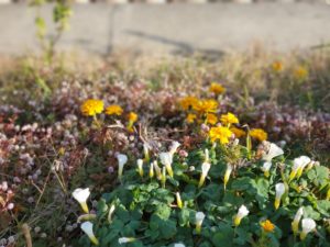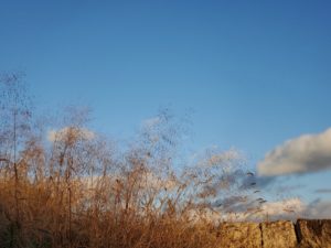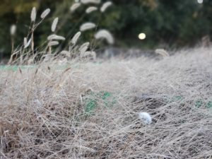 イネ科の隙間からタンポポの綿毛。